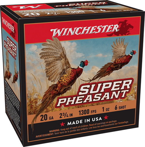 Winchester Super Pheasant Magnum shotshells are loaded with 1-1/4 ounces of copper-plated lead #6 shot at 1250 fps, designed for hunting game birds like pheasants at extended range. The high brass construction and tight-patterning wad provide consistent performance and reliable ignition. This 20-gauge, 3-inch magnum load delivers the hard-hitting power hunters expect from Winchester's premium ammunition line.