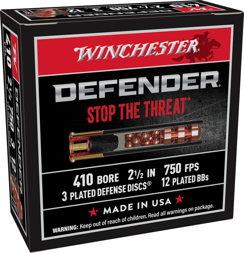 .410 Bore defensive shotshell loaded with 3 Defense Discs and 12 BB pellets, delivering 750 fps muzzle velocity. Designed for personal protection and home defense at close range with consistent performance and reliable stopping power. Features a black hull and high-base construction for dependable operation in .410-compatible handguns and shotguns.