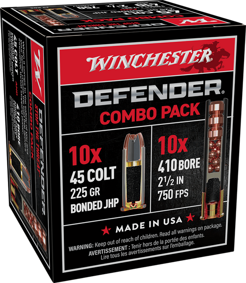 Winchester PDX1 Defender 410 Gauge 3" shotshell combines 4 plated Defense Discs and 16 plated BB pellets for personal defense applications. Featuring a black hull and black oxide high-base head design, this load delivers 750 fps muzzle velocity and is effective in both .410 compatible handguns and shotguns for short-range threat engagement.