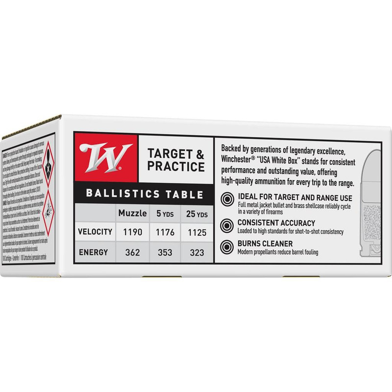 Winchester USA 9mm Luger centerfire handgun ammunition features 115 grain full metal jacket bullets with a muzzle velocity of 1190 fps and muzzle energy of 362 ft-lbs. Brass cases with Boxer primers are reloadable, offering consistent performance and value for target shooting and training.