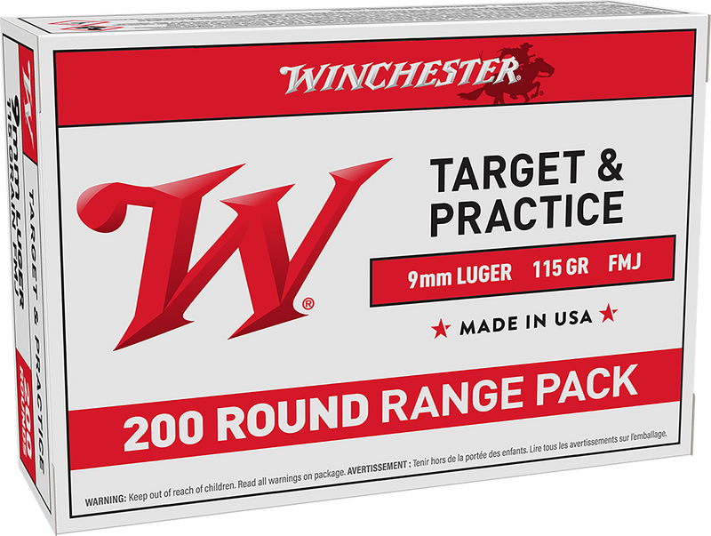 Winchester USA 9mm Luger ammunition loaded with 115-grain full metal jacket bullets at 1190 fps muzzle velocity, delivering 362 ft-lbs of energy. This brass-cased, boxer-primed ammunition is ideal for high-volume range training and target practice with smooth feeding and reduced barrel fouling. 200 rounds per box.