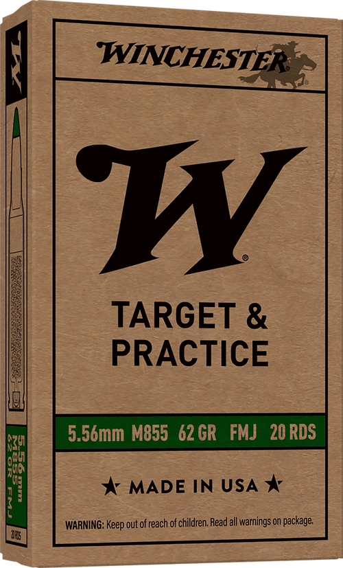 Winchester USA M855 Green Tip ammunition in 5.56x45mm NATO features a 62-grain full metal jacket bullet with a muzzle velocity of 3060 fps and muzzle energy of 1289 ft-lbs. This Lake City manufactured ammunition is packaged with 500 rounds per box on brass cases, suitable for target shooting and general rifle use.