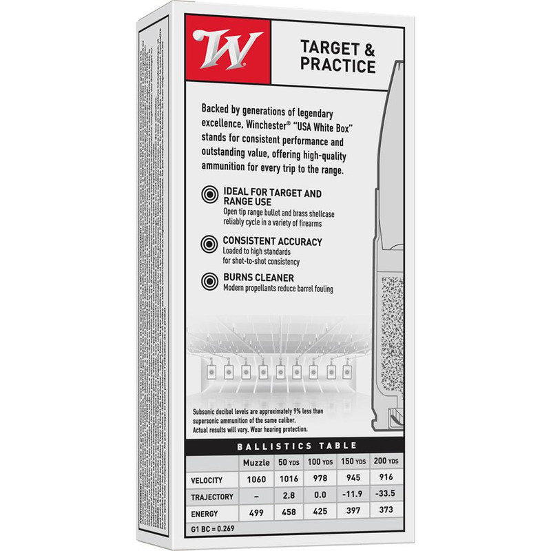 Winchester USA .300 AAC Blackout rifle ammunition features a 200 grain full metal jacket bullet designed for consistent performance and reliable functioning. Loaded to 1060 fps muzzle velocity with 499 ft-lbs of energy, this ammunition delivers good accuracy with no barrel leading and is housed in reloadable brass cases.