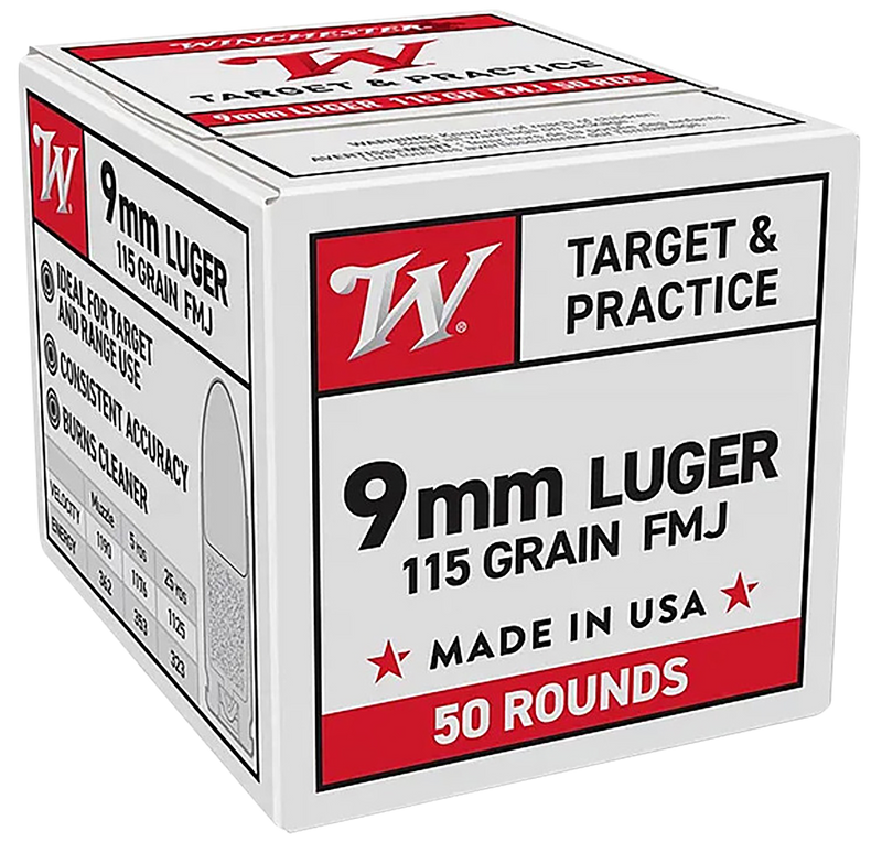 Winchester USA White Box 9mm Luger ammunition features 115 grain full metal jacket bullets with a muzzle velocity of 1190 fps and muzzle energy of 362 ft-lbs. Loaded with brass cases and boxer primers, this ammunition is ideal for target shooting, training, and range practice with clean-burning powder and dependable performance.