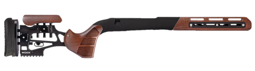 The Woox Furiosa is a chassis system designed for Remington 700 M5 DBM short-action bolt-action rifles, featuring a walnut wood and aluminum construction with a 31" overall length and 14"-15" length of pull. This chassis provides a modern ergonomic platform while maintaining traditional wood aesthetics. The modular design offers improved accuracy and handling characteristics for precision shooting applications.