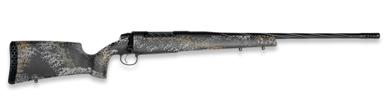 The Weatherby 307 Alpine ST is a bolt-action rifle chambered in 338 Weatherby RPM with a 24" spiral fluted, threaded barrel (5/8x24) and 4+1 capacity. It features a carbon fiber Peak 44 Bastion stock with green and tan accents, graphite black Cerakote finish, and is drilled and tapped for optics mounting. Weighing 6.9 lbs with an overall length of 44", this rifle combines precision engineering with a lightweight, compact profile suitable for hunting and long-range shooting.