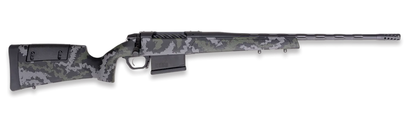 The Weatherby 307 Range XP 2.0 is a bolt-action rifle chambered in 338 Weatherby RPM with a 24" skip-fluted threaded barrel and 5+1 capacity. Built on Weatherby's new 2-lug Model 307 action with Rem 700 compatibility, it features a TriggerTech trigger, Magpul AICS bottom metal, and an adjustable synthetic stock with cheek piece and LOP adjustment. The rifle comes with a muzzle brake and weighs 8.1 lbs.