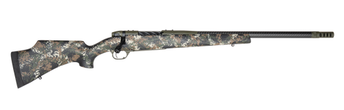 The Weatherby Mark V Accumark is a bolt-action rifle chambered in 25 Weatherby RPM with a 24" threaded barrel and 4+1 capacity. Features include a graphite black Cerakote finish, black fiberglass Monte Carlo synthetic stock, TriggerTech trigger, and Accubrake ST muzzle brake. Drilled and tapped for optics, this rifle weighs 7.3 lbs and has an overall length of 44.25".