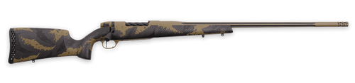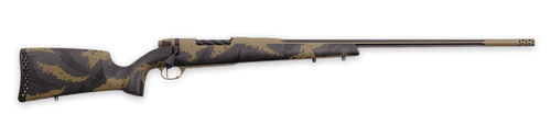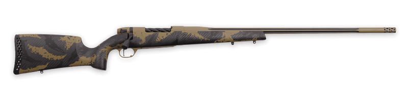 The Weatherby Mark V Apex is a bolt-action rifle chambered in 7mm PRC with barrel lengths between 26" and 28" and a 3+1 capacity. Built on the iconic Mark V steel action with a fluted, two-toned cerakoted barrel (Coyote Tan and Graphite Black), it features a carbon fiber stock with tan and brown accents, TriggerTech trigger, Accubrake ST muzzle brake, and a threaded barrel. This lightweight long-range hunting rifle weighs approximately 7.5 lbs and is drilled and tapped for optics.