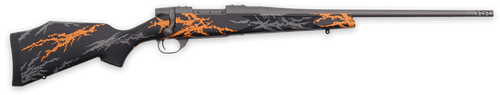 The Weatherby Vanguard Compact Hunter is a bolt-action rifle chambered in 243 Winchester with a 20" cold hammer-forged threaded barrel (1/2x28 thread pitch) and 5-round capacity. Features include a tungsten cerakote finish, adjustable two-stage trigger, fluted bolt body, drilled and tapped receiver, and black synthetic stock with orange and gray sponge accents. Weatherby guarantees sub-MOA accuracy, includes length-of-pull spacers for adjustability, weighs 6.5 lbs, and has an overall length of 39".