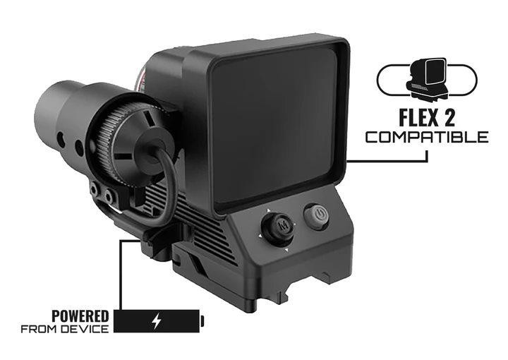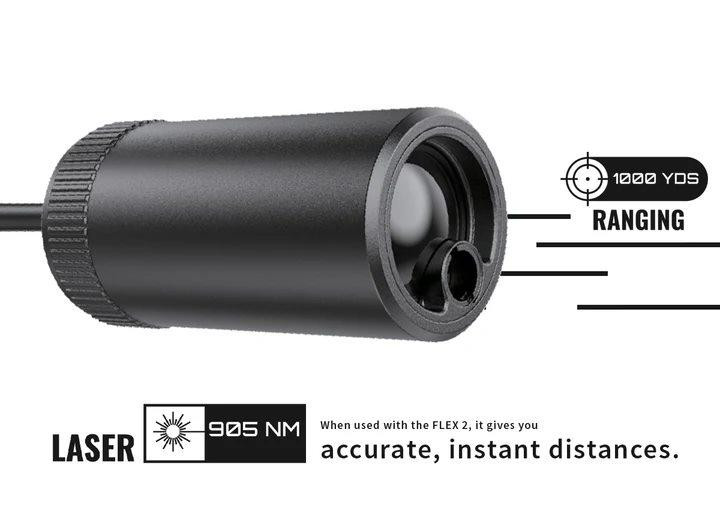 This thermal laser rangefinder module attaches to the X-Vision Optics Flex 2 Thermal Reflex Sight to provide accurate instant distance measurements up to 1000 yards displayed directly on your optic. Constructed from lightweight aluminum with water and dust resistance, it features shock load rating up to 800G and uses a 905nm laser. The module mounts securely via clamping bracket and positioning ring, powered directly from the host thermal device.