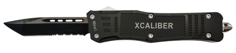 The Xcaliber 40 Cal is a large OTF (out-the-front) folding knife featuring a 3.80" tanto blade with partial serration made from 440C stainless steel. With a 5.30" steel handle and 9" overall length, this knife offers a substantial grip and cutting surface. It comes with a nylon sheath for carry and storage.