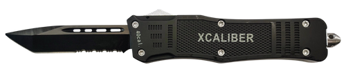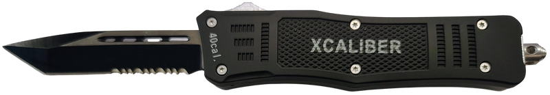 This Xcaliber 40 Cal medium OTF (out-the-front) folding knife features a 3.25" Tanto blade with partial serration made from 440C stainless steel. The knife has a 4.64" steel handle and overall length of 7.75", weighing 6.67 oz, and comes with a nylon sheath for carry and storage.