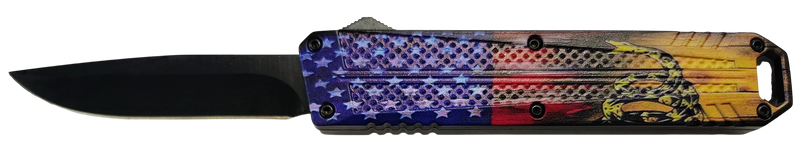 This OTF (out-the-front) folding knife features a 3.20" drop point blade made from 440C stainless steel with a plain edge. The 4.80" handle is constructed from US Flag aluminum, and the knife comes with a nylon sheath for carry and storage.