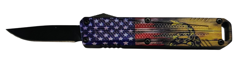 This Xcaliber Drop Point Mini features a 1.80" 440C stainless steel blade with a plain edge and a 3.52" aluminum handle decorated with a US flag design. The knife has an overall length of 5.44" and weighs 2.47 oz, making it compact and lightweight for everyday carry or outdoor use.