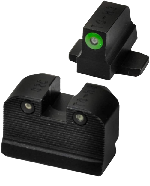 This 3-dot tritium night sight set features #8 green tritium front and #8 square notch rear sights with steel frames for protection and durability. The sights provide superior illumination in low-light conditions while remaining bright and white for daylight use, with a tested lifespan of over a decade. Compatible with multiple Sig Sauer pistol models including P224, P226, P228, P229, P239, P290, P320 Sub Compact, and SP2022.