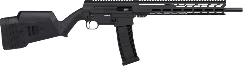The CMMG Dissent BR4 is a 9mm Luger semi-automatic rifle with a 16.10" black nitride steel barrel and 10+1 capacity. Features an aluminum receiver with black armor cerakote finish, 13.50" M-LOK handguard, Magpul SGA polymer stock, and single-stage trigger. Weighs 7.60 lbs with an overall length of 36.70".