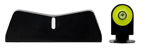 Tritium-powered front night sight with 0.188" big dot and high-contrast green with yellow outline for low-light visibility. Features a low-profile white stripe rear sight and rear ledge for one-handed manipulation. CNC machined steel construction with 10-year warranty.