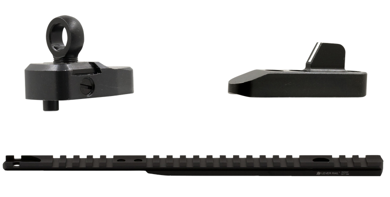 This iron sight set combines a Picatinny rail for optic mounting with rugged backup iron sights for Marlin 1895 lever-action rifles. The front sight features a white stripe for visibility, while the rear ghost ring sight is fully adjustable for windage and elevation with two interchangeable apertures (.230" and .191" inside diameter). Constructed from anodized aluminum rail and blued steel components, it allows flexible scope placement directly over the receiver or forward for scout scopes and red dot sights.
