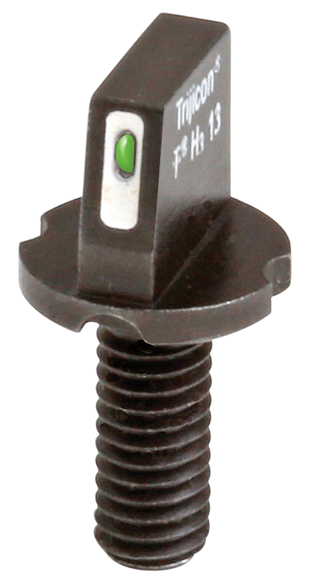 Tritium front sight post with green tritium element and white outline for low-light and night shooting applications on AR-15 rifles. Features mil-spec A2 housing compatibility, steel frame construction, and 5.0 MOA elevation adjustment. Installation tool included.