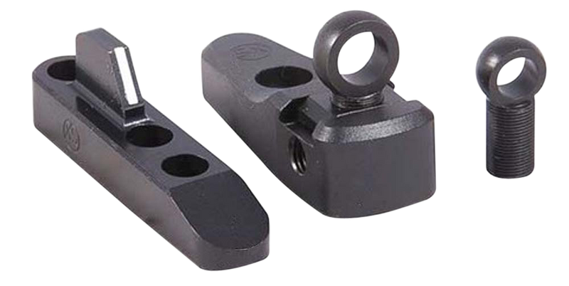 Adjustable ghost ring sight set designed for Marlin 1895 lever-action rifles in .45-70, .450, and .444 calibers. Features a rear ghost ring with .191 and .230 aperture options and a white-striped front sight with opposing screw windage adjustment and aperture thread elevation adjustment. Constructed of blued steel with matte finish for reliable performance and durability.