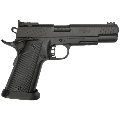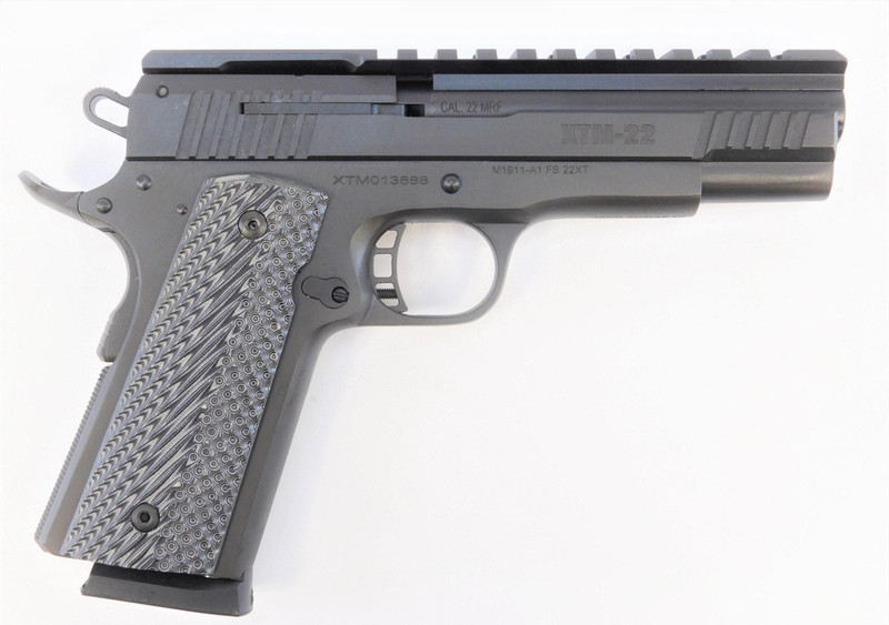 Semi-auto 1911-style pistol chambered in 22 Winchester Magnum Rimfire with a 5-inch fixed bull barrel and 14-round capacity. Features a tactical top Picatinny rail, extended upswept beavertail, skeletonized hammer and trigger with adjustable overtravel stop, and black parkerized finish on steel frame with G10 grips. Weighs 2.5 lbs. with an overall length of 8.54 inches.
