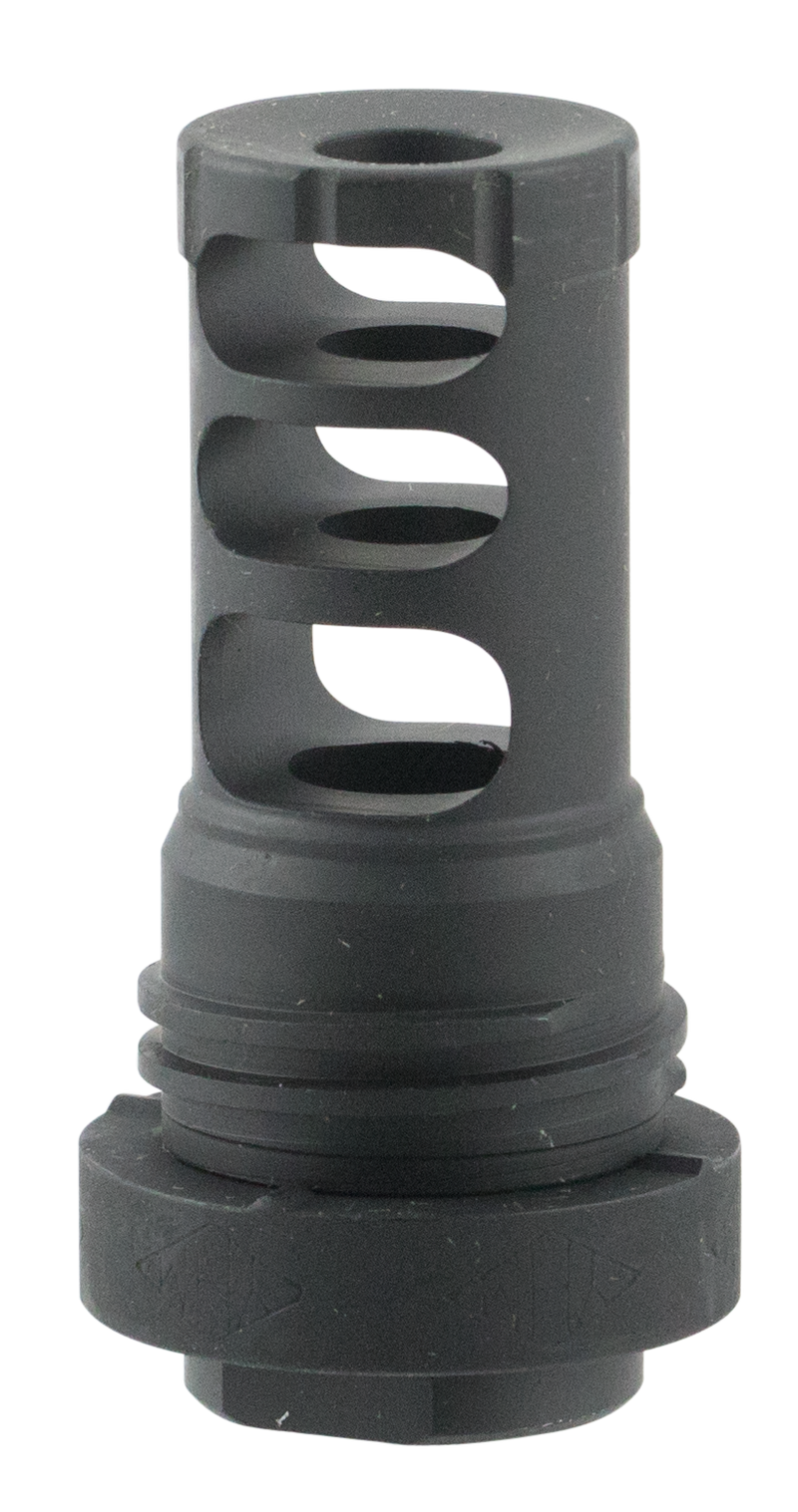 Quick-detach muzzle brake designed for 5.56mm NATO AR-platform rifles with 1/2"-28 threaded barrels. Features a 5-port design with no downward-facing port to reduce dust signature in prone shooting positions while providing recoil compensation. Constructed from black steel with improved mounting surface for quick attachment and easier cleaning.