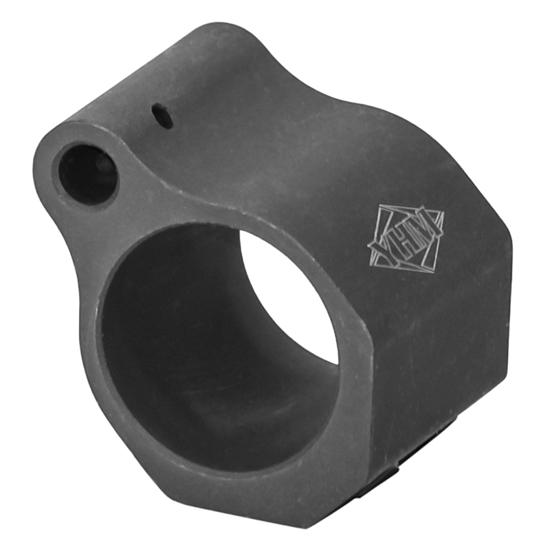 Low profile gas block designed for .750" diameter barrels, featuring a set screw mounting system that replaces the existing front sight. Manufactured from high-quality steel with mil-spec phosphate coating for durability. Dimensions: 0.95" length, 5.5" overall, enabling rifle-length forearm mounting on carbine-length barrels.