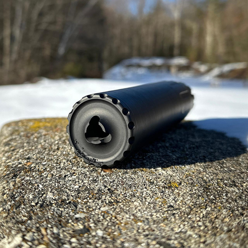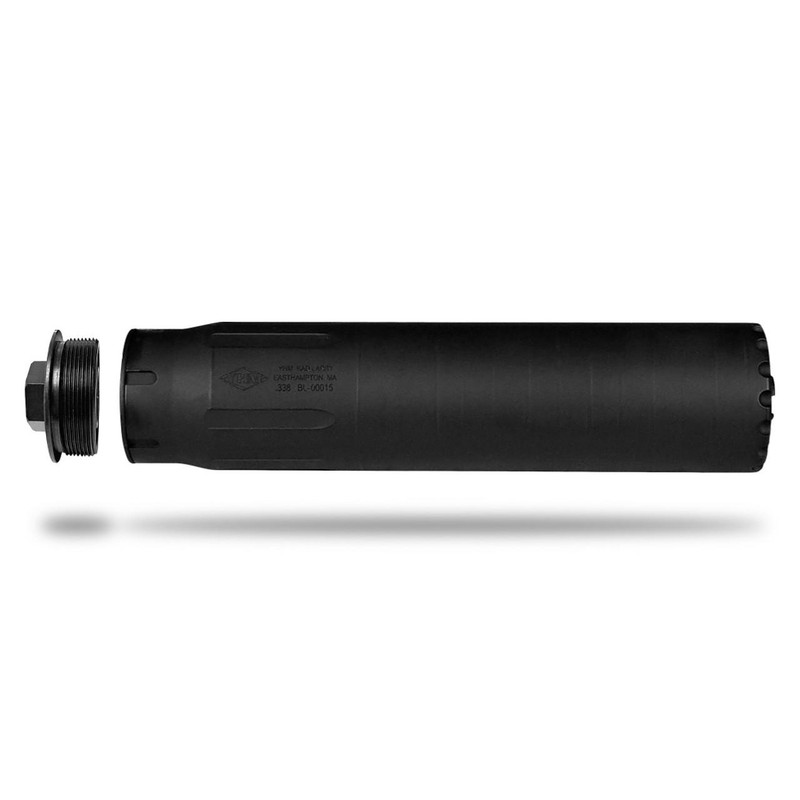 The Bad Larry .338 is a direct-thread suppressor designed for big-bore long-distance shooting, including .338 Lapua Magnum and 8.6 BLK. Constructed from heat-treated 17-4 PH stainless steel with Cobalt 6 baffles, it measures 7.375" in length with a 1.75" outside diameter and weighs 17 oz. The suppressor includes a 5/8x24 direct thread adapter and is rated for full-auto use.