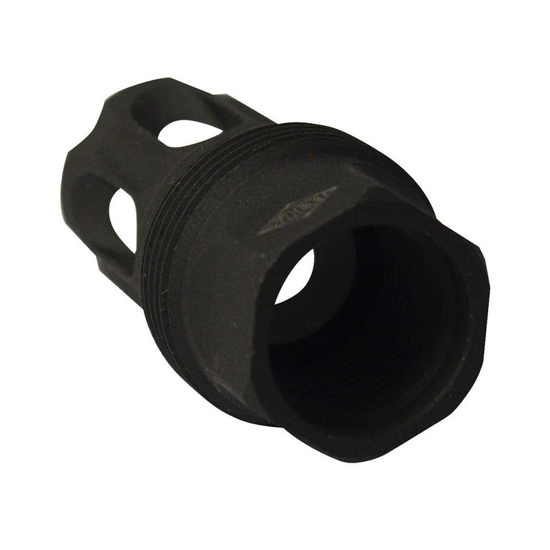 Quick-detach flash hider designed for rifles with 5/8-24 threaded muzzles, featuring an internal taper seal and compatibility with the industry-standard 1-3/8" x 24 HUB mounting interface. Constructed from 4140 steel with black phosphate finish for durability and corrosion resistance. Measures 1.8125" in length with a 0.75" diameter.