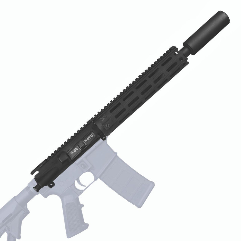 This integrally suppressed upper receiver assembly combines an 11.5" 5.56mm barrel with a pinned and welded Turbo K-RB suppressor, achieving an overall length of approximately 23-23.5" and requiring only a single tax stamp. The system includes a lightweight M-LOK handguard, Mil-Spec A3 upper receiver, and specially designed gas block that reduces blowback and cyclic rates. Full-auto rated construction with 17-4 PH stainless steel and Cobalt 6 baffles.