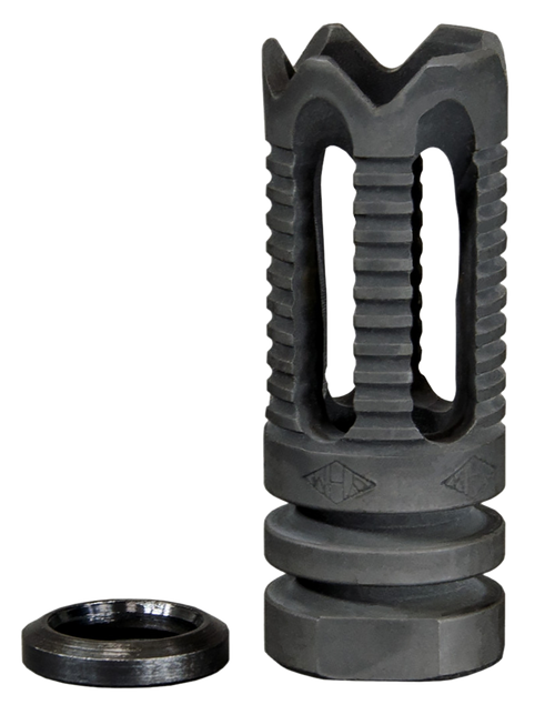 This 5.56 NATO suppressor features a tubeless design constructed from heat-treated 17-4 stainless steel with a heat-treated blast baffle, reducing blowback compared to previous models. The suppressor is full-auto rated and designed for rigorous use, with a blast chamber threaded to the 1.375-24 HUB standard for compatibility with various mounting options. The included flash hider features a notched rim and tri-port design.