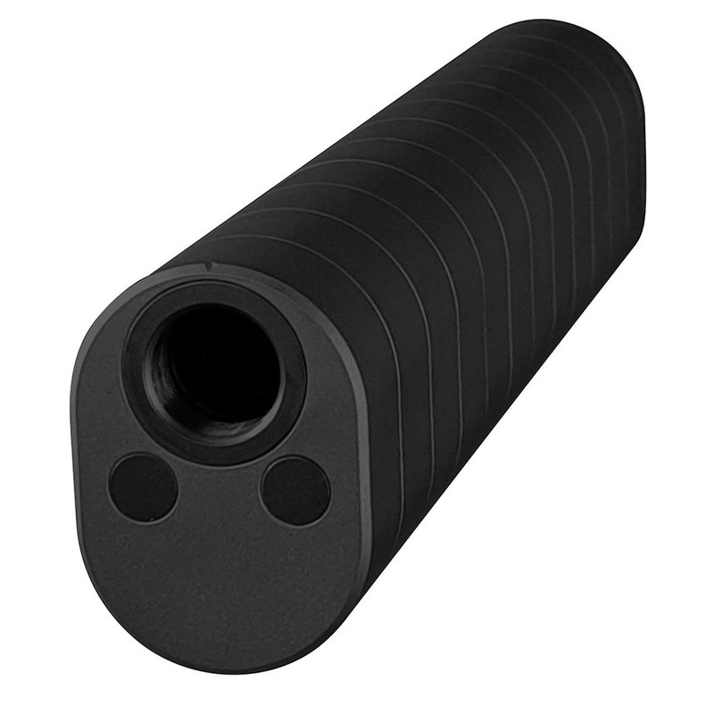 The Victra-12 is a modular 12-gauge shotgun suppressor constructed from 7075-T6 aluminum and 17-4 PH stainless steel with hard anodized black finish. In full 12-inch configuration, it reduces most commercial shotgun loads to 135 dB at the shooter's ear while decreasing felt recoil. The modular design allows users to remove sections to customize sound suppression, firearm balance, weight, and overall length.