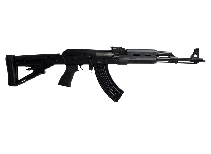 Semi-automatic AK-style rifle chambered in 7.62x39mm with a 16.3" chrome-lined barrel and 30+1 round capacity. Features a blued finish, black polymer furniture including Tango Down grip and Promag adjustable stock, with open adjustable sights and a 1.5mm bulged trunnion receiver for enhanced durability.