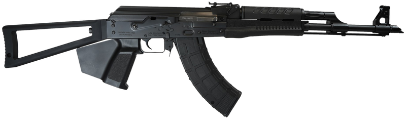 Semi-automatic AK-pattern rifle chambered in 7.62x39mm with a 16.25" cold hammer forged chrome-lined barrel. Features a fixed triangle folding stock, polymer handguard, featureless paddle grip, adjustable sights, and 10+1 round capacity. California-compliant configuration with 1.5mm bulged trunnion receiver and threaded barrel; weighs approximately 7.9 lbs.