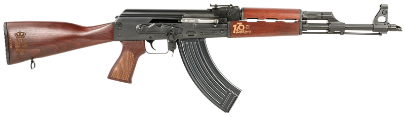 Semi-automatic AK-pattern rifle chambered in 7.62x39mm with a 16.3" chrome-lined steel barrel and 30+1 round capacity. Features a buldged trunnion 1.5mm receiver, adjustable sights, lever safety, and gold-engraved Serbian red wood furniture. Weighs 7.90 lbs and has an overall length of 38.7".