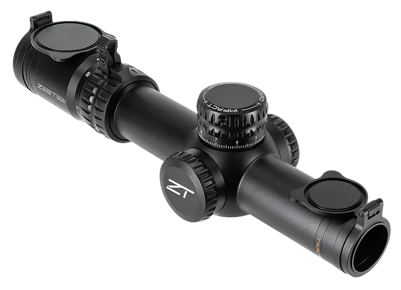 The Zero Tech Optics Thrive ED is a 1-10x24mm variable power riflescope with a 34mm tube and first focal plane (FFP) design. Features an illuminated RMG-L reticle optimized for low power variables, WeatherShield protection, locking turrets with zero reset, and fixed 100-yard parallax adjustment. Weighs 25.64 oz with 3.7" eye relief and provides 117.3-11.3 ft field of view at 100 yards.
